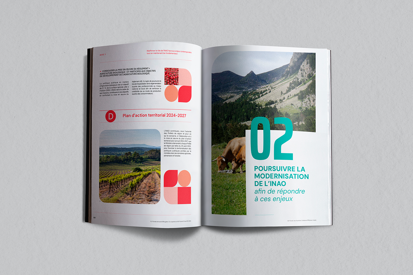 Le projet : mise en page du contrat d’objectifs et de performance 2024-2028 de l’Institut national de l’origine et de la qualité (INAO). Un document officiel présenté à l’occasion du Salon de l’agriculture 2024 et signé par Marc Fesneau, ministre de l’Agriculture et de la Souveraineté Alimentaire.