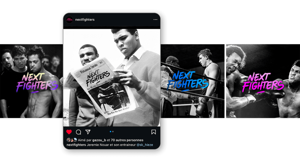 La stratégie : utiliser des images populaires cinématographiques et historiques qui évoquent la boxe, le combat, la lutte. Création des post Instagram de lancement, des capsules vidéos de motivation et de l’animation du logotype.