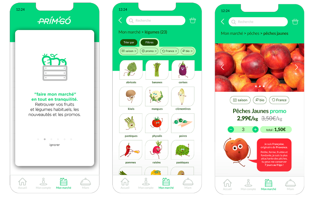 Déclinaisons : conception du web/UX design de l’application permettant la commande de fruits et légumes en toute simplicité, c’est le marché sur votre smartphone.
